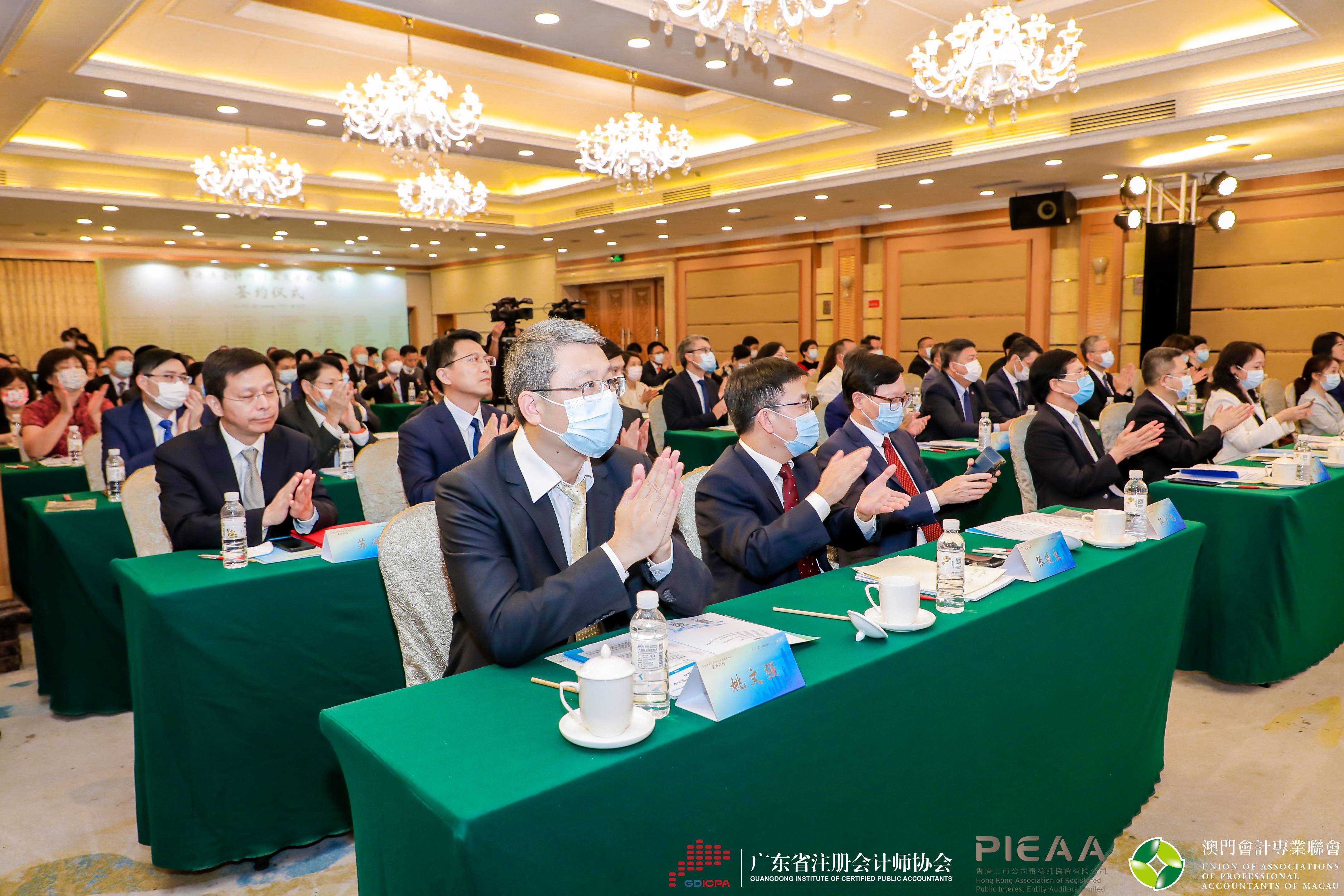 签约仪式在广州,香港,澳门三分场会以视频连线方式进行,由广东省注册会计师协会秘书长穆惠姝主持,广东省人民政府林克庆常务副省长,广东省财政厅戴运龙厅长,香港特区政府财政司陈茂波司长,澳门特区政府经济财政司李伟农司长,以及省注册会计师协会等相关部门领导参加会议。