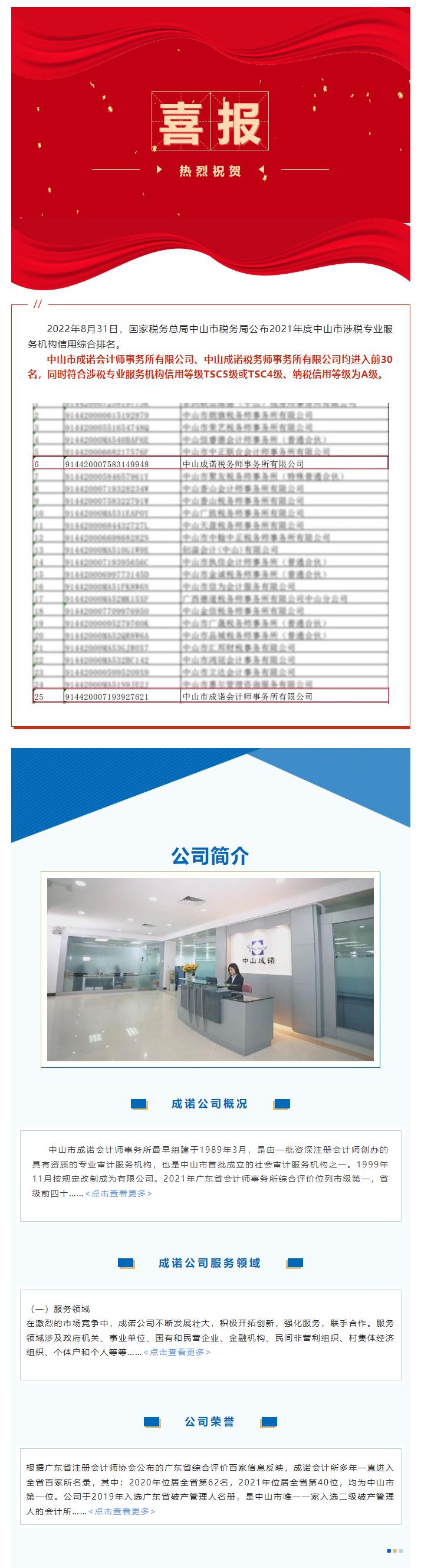 【成诺荣誉】| 喜报:中山成诺税务师事务所有限公司、中山市成诺会计师事务所有限公司共同进入2021年度中山市涉税专业服务机构信用综合排名前30名!
