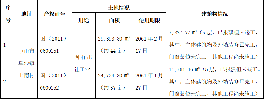 其主要资产是广东省中山市阜沙镇上南村两宗房地产,土地面积54,118.60㎡(约81亩)、建筑面积19,099.23㎡(已办理报建手续,但未竣工未办理产权登记)。具体如下: