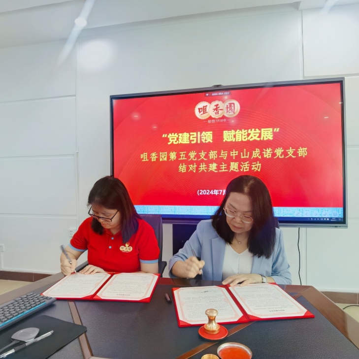 现场,中山成诺党支部和中山市咀香园第五党支部共同签署了党建结对协议。双方将以党建引领,加强党建交流、财务管理等方面的合作,助力企业发展迈上新台阶。