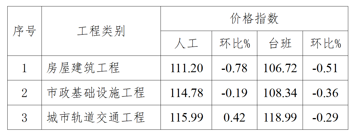 现发布我省房屋建筑工程、市政基础设施工程和城市轨道交通工程2022年10月人工价格指数和台班价格指数如下:
