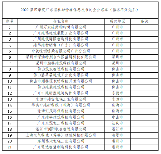 经我站联合广东省建筑材料行业协会装配式建筑分会组织力量采集、编审,现发布2022年第四季度广东省(大湾区)装配式建筑预制构件市场价格参考信息(详见附件1),供各单位参考应用。相关事项说明如下:
