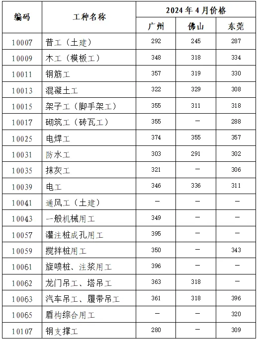 根据广东省工程造价信息化平台(http://www.gdcost.com/)监测数据和相关信息,现发布2024年4月广东省建筑安装和城市轨道交通工程劳务市场用工价格监测情况,供各方参考。